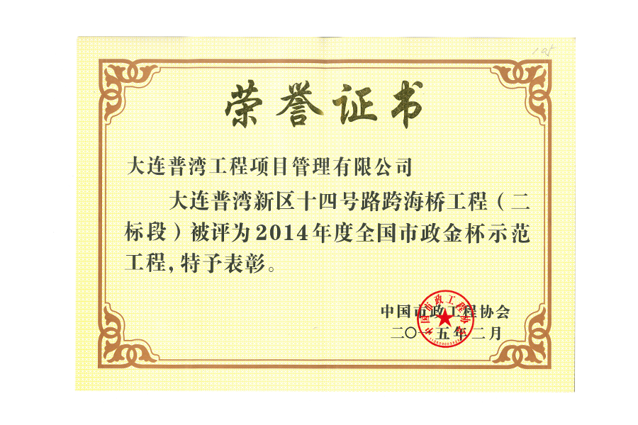 • 十四號路跨海橋工程獲獎(jiǎng)證書